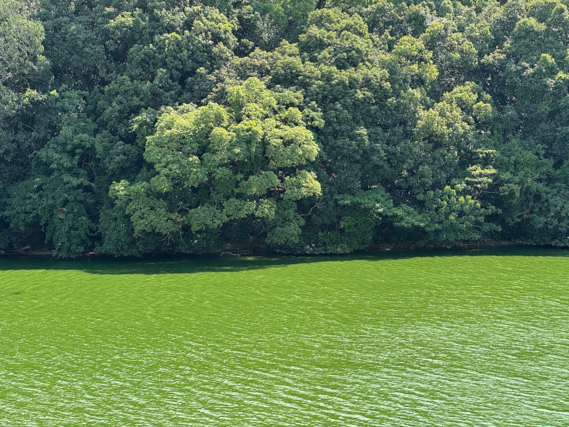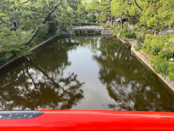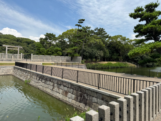 じつはあの正面にある鳥居の向こう側もお堀になっています。