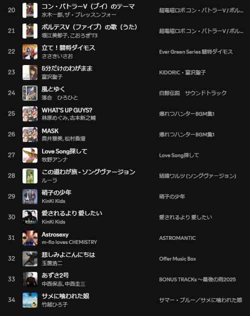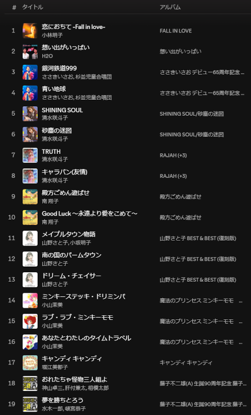 なんか仕事があれなのでさらっと。 今年に入ってからサブスク配信開始されたものとか、 気づいたものとか、あとちょっとネタ的なやつとか。 いい流れきてる気がします。マジカルエミが待たれますね。 もちろんこれが入ってるならあれも入ってるよね、 というのがたくさんあるのでその目でお確かめください。入ってないのもある。 「恋におちて」、ついに配信開始です。 ダイヤル回すとこだけでなく、土曜の夜と日曜を独占したいところも昭和ならではですよね。 そういえばまだ週休2日じゃなかったー。 「想い出がいっぱい」もようやくです。しんみり。もちろん ED もあるよ。 ささきいさおのベスト盤は本当にありがたいですね。いや大半の曲は手元にあるとはいえ。 999 の OP と ED は何度聴いても泣けてきます。 たぶん僕のアニソンベスト1は 999 の OP になる気がします。 ガンダムと過ごした時間を優先するかどうか次第、みたいな。 そして何気なく聴いてるとポリマーはやっぱりやかましいな(笑) シュラトも聴けるようになりました。4曲ともやっぱりとてもいい。 トルーパー、シュラトときたので、そろそろ星矢が待たれますよね。 あと超者の「仮面」のフルコーラスをですね……。 うる星やつらも好きなとこが配信されてきた感じです。 というかジュークボックス2は全曲はやく出してほしい。 山野さと子のベストもいろいろあってありがたいやつ。 パームタウン編の序盤はいまでいう NTR 感がすごかったですよね。 お、おれたちが一緒に一年すごしたメイプルタウンを忘れておまえ……みたいな。 引っ越して作品が継続するアニメって、そういえばあんまりないような気がします。 ミンキーモモも配信されました。なぜかいまでもときどき脳内で口ずさむ。 OVA の志賀真理子の曲は前から配信されてました。 キャンディ キャンデイ、これだけぽつんと配信されてましたけど……。 藤子・F・不二雄につづき、藤子不二雄Ⓐのアニソン集も出てくれました。 ハットリくんやオバQ、ウルトラBとかもあるよ。 怪物くんの ED と猿の OP の冒頭の台詞もなぜかときどき脳内で回る。 コンV、ボルテス、ダイモスと長浜ロマンロボも出てきました。 5分だけのわがままは 2023 年でした。勘違い。 LA ROSE ROUGE はあいかわらずまだ未配信です。何故。 MIO の GET IT! もいつ配信されるのか。ひろえ純の COOL は。 白鯨伝説、いま改めて聴くとめちゃくちゃいい曲なんですけど……。 爆れつハンター、曲だけは声優のほうですでに配信だった気がしますが一応。 このころの勢いとリズム感がやっぱり好き。 ドラクエ歌も。ただ BGM は Spotify には配信されないのよね。 KinKi。これは前に書きましたね。この2曲は当時シングルも買いました。 m-flo で一番好きな曲。 サンケイ新聞版の鉄腕アトムを思い浮かべながら聴くと泣けてきます。 玉置浩二の「悲しみよこんにちは」、思ったよりずっと優しく歌ってて意外。 いい曲です。 あずさ2号、こんなコンビで出されるととりあえず一度聴いてみたくなりますよね。 最後はたまたま目に入った曲。ラストの絶叫が(笑) キン肉マン、このときのために II 世を読んできたわけですが、 まさかマッスルドッキングの新しい形を見られるとは。 というかキン肉マンが頼もしすぎてカオスのほうが主役になっちゃってるな(笑) ゴールドが高すぎるけど、まだまだ上がる要因しかないのが怖い。 あきらかにプーチン、ネタニヤフ、トランプ、習近平のせいです。 少なくともトランプが大統領のあいだは上しかないのでは……。 であ。PR