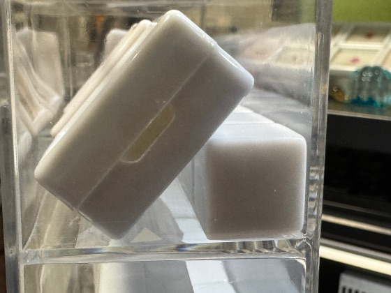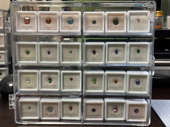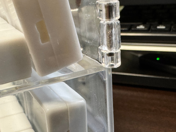 で、ジュエルケースの足元に 3 mm の透明アクリル三角棒を置いて、
